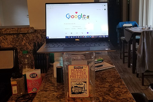 - I moved my operations onto the kitchen counter top. Have you noticed how tricky it is to get your camera at the right height on video conferencing? So I had to improvise – note the peanut butter pretzel snacks in the above photo!